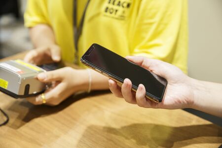 Secure payment technology concept and service charge, customers are using their phone to pay using paywave technology by tapping near the electronic card terminal.