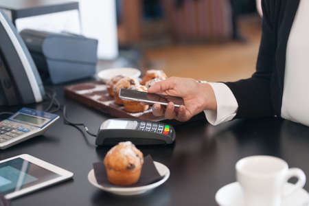 Customer making payment using NFS technology at coffee cafe. Small business owner and contactless or wireless payment concept.