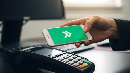 The a person's hand holding a white smartphone with a green screen displaying a white arrow symbol. The smartphone is positioned above a black payment terminal with a keypad. The scene appears to be set on an office desk with a keyboard partially visible in the background. The overall setting suggests a business or financial transaction taking place using mobile payment technology.