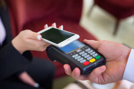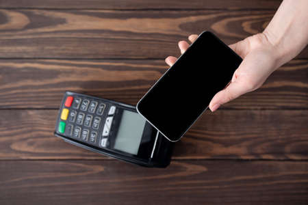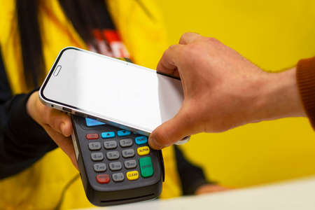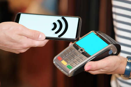 Payment with NFC technology by mobile phone. Modern cashless payments.