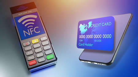 NFC equipment. Payment terminal with NFC logo. Bank card in phone screen. Bank payment equipment. Bank terminal with NFC technology. Payments by phone. Cashless pay illustration. 3d rendering