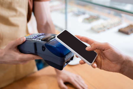 Cropped view of african american client paying with smartphone near seller in sweet shop