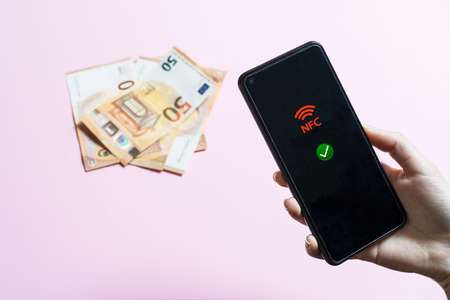 the girl is holding a cellphone in her hand with the NFC icon on the screen and with some euro banknotes in the background