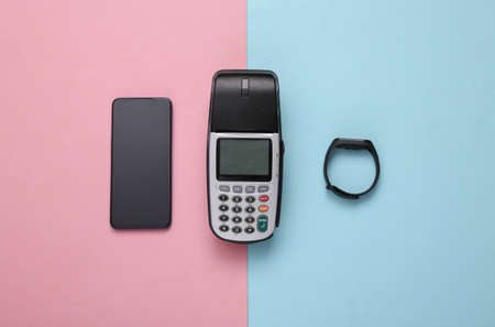 Payment terminal with smartphone, smart bracelet on pink blue background. contactless payment. top view