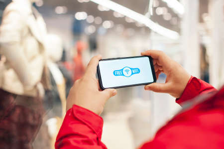 Free internet in the supermarket. Man holds a mockup of a smartphone with an icon on a white screen background.