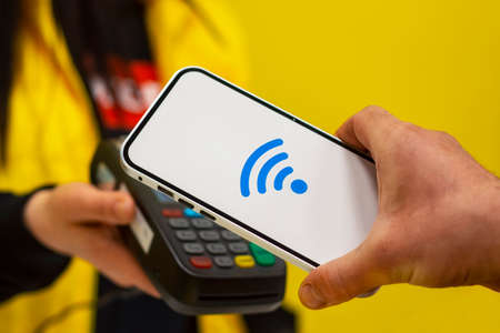 A woman keeps paying for a purchase using a smartphone using a payment terminal.On the phone screen-wi-fi network. NFC concept, business and banking operations.