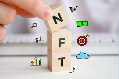 NFT text on wooden blocks as innovation in the digital goods trade concept