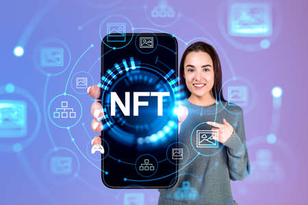 NFT crypto art. Future of freelance concept background. Woman trade with non fungible token on mobile phone. on the screen