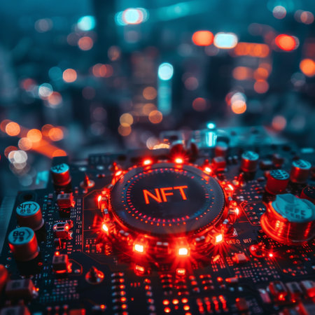 Concept of NFT (Non Fungible Token) on the corner of an electronic board illuminated with reddish light and artificial light rays