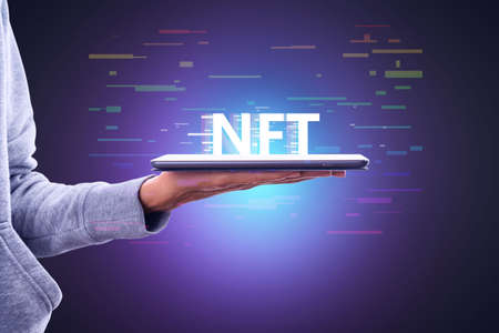 NFT Non fungible token. Man holding tablet with NFT non fungible token.