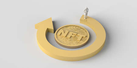 Circular arrow with NFT and man. Non fungible token concept of crypto art on the blockchain. Copy space. 3D illustration.