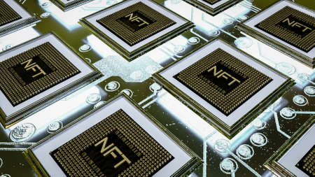 NFT 3d image. Blockchain Non Fungible Token idea. Computer chip NFT on digital background. Cryptocurrency, cryptoeconomics, blockchain technology concept
