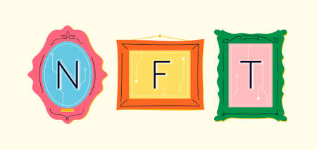 Abstract NFTs in bright frames. Colorful retro and vintage picture frames. Digitization of art. modern technologies. Hand-drawn vector illustration. flat design.