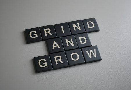 Black letter tiles spell out the motivational phrase Grind and Grow on a smooth surface, symbolizing perseverance and the journey toward personal success.