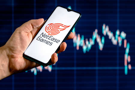 Kazan, Russia - August 21, 2021: NetEase is a chinese company that produces internet technologies and video games. A smartphone with the NetEase logo in a hand. Stock chart on the background.