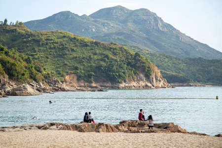 Couples take photos on a beach near the electricity plant of Lamma Island, Hong Kong.