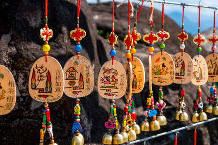 2019, November 21st, Pai, Mae hong son, Thailand. A lot of Chinese style amulets hanging on the wooden shrine. use for making wishes for love and life.