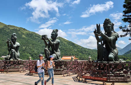 People walking pray around Tian Tan Buddha and three of the six Devas,The Big Buddha on Lantau Island, Hong Kong.