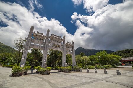 Hong Kong - November 20, 2015: Entrance Gate to the Po Lin Monastery. Buddhist Monastery or Temple of the Treasure of the Lotus.