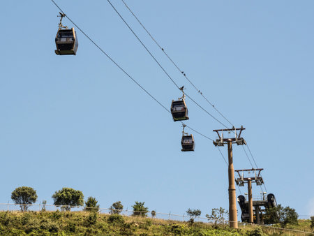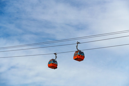 Barcelona, Spain - April 15, 2016: Cable way against the blue sky in the mountain of Montjuic. Inside the cabin, some tourists enjoy the scenery