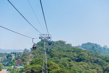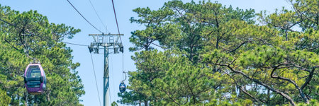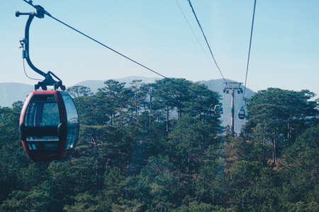 Circulating cable car between Dalat bus station and Robin Hill Truc Lam Vietnam. Close-up view of intermediate support tower. Picturesque landscape view. Pine forest tree tops, mountain. Collection