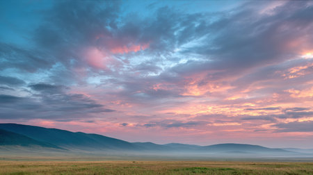 Fog drifts across a wide grassland plain as the sun rises, creating soft colors in the sky and revealing distant mountains and hills.