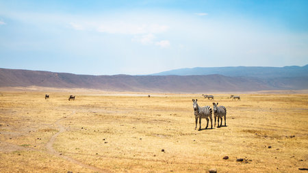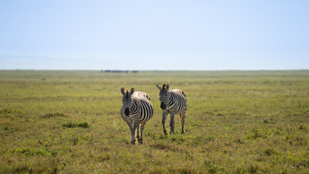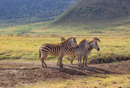 Zebras in a row on Ngorongoro Conservation Area crater, Tanzania. African wildlife