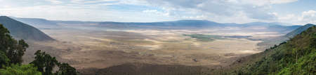 Panoramic view of the Ngorongoro Conservation Area on a clear day from the mountainside. Tanzania, Africa.