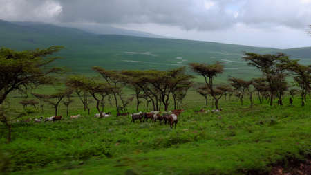 Masai' goats while safari in Ngorongoro national park, Tanzania, Africa. Blured in motion from car. Green savanna with trees, cloudy day.