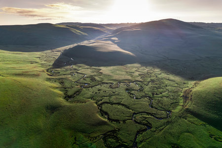 Aerial drone panorama landscape photo of Persembe Plateau (aka PerÅŸembe Yaylasi), creek meander (aka meander) and sheep on grassland, Aybasti, Ordu, Black Sea Region of Turkey