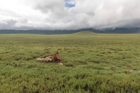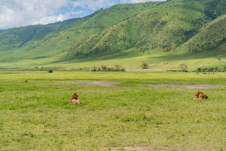 Three male Lion lies on grass at Ngorongoro Conservation Center - crater, Tanzania. background wildbeest and mountain