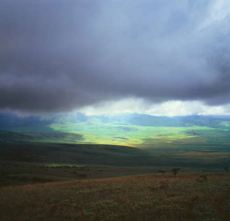 Ngorongoro Crater Conservation Area on a background cumulus clouds with the rays of the sun, Tanzania. East Africa