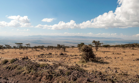 Road through the wooded hills in the background of a fluffy clouds in Ngorongoro Crater Conservation Area, Tanzania. East Africa