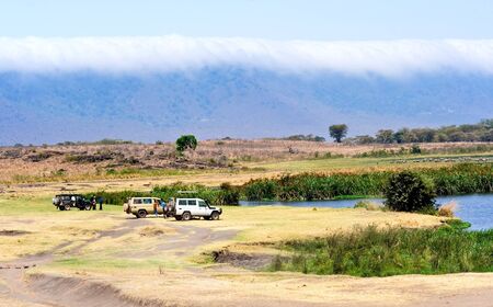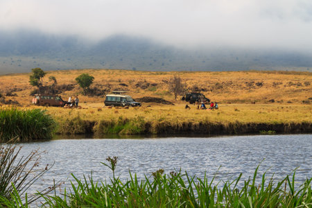 Ngorongoro Crater National park, Tanzania - September 13, 2021: Tourist safari cars parked in shore of beautiful lake in Ngorongoro Crater national park, Tanzania