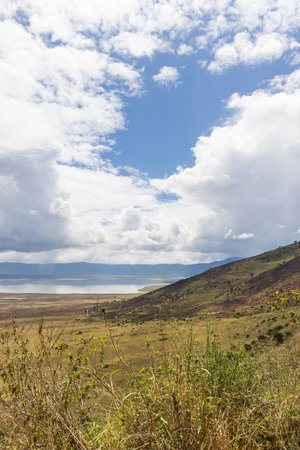 Panorama of Ngorongoro crater National Park with the Lake Magadi. Safari Tours in Savannah of Africa. Beautiful landscape scenery in Tanzania, Africa
