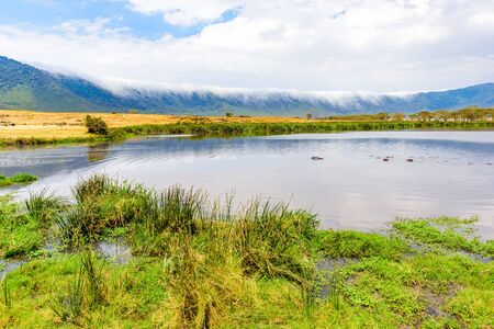 Hippo Pool in the Ngorongoro crater National Park. Safari Tours in Savannah of Africa. Beautiful wildlife in Tanzania, Africa