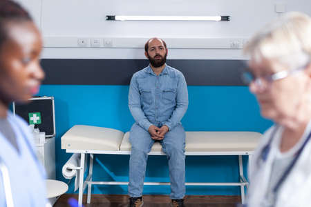 Patient with disease waiting for consultation and diagnosis in medical cabinet. Man sitting on bed to receive healthcare examination at checkup visit appointment with physician.