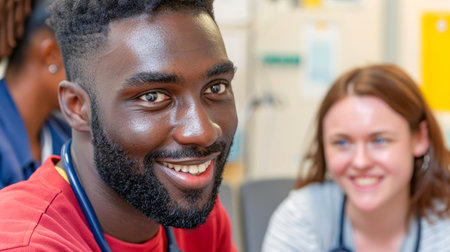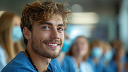 A group of diverse healthcare workers in a hospital demonstrates their commitment to LGBTQ equality by wearing rainbow pins on their uniforms promoting acceptance and respect for all during Pride Month