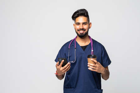 Handsome indian medical doctor is using a smartphone, holding a cup of coffee and smiling while standing on gray background