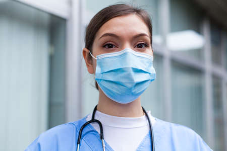 Closeup portrait of very tired exhausted UK NHS ICU doctor in front of hospital,Coronavirus COVID-19 pandemic outbreak crisis,sleep deprived EMS medical staff working long shifts,ER patient treatment