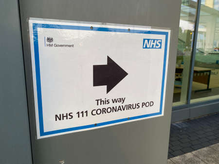 OXFORD, UK - May 2020: A directional sign for an NHS hospital Coronavirus pod