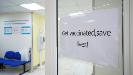 A clear sign encourages individuals to get injured to save lives, displayed in a healthcare setting with blue seating in the background