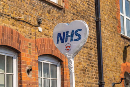 LONDON, UK - 9TH APRIL 2020: A homemade NHS sign in the shape of a heart with a picture of a happy face in love on it. Taken during the lockdown Coronavirus crisis in the UK.