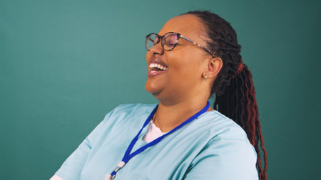 Headshot portrait of nurse in blue uniform looking at camera on light studio background