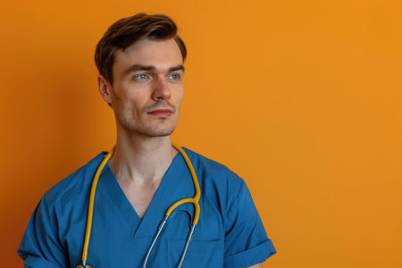 A man in a blue scrubs shirt and a yellow stethoscope is looking at the camera