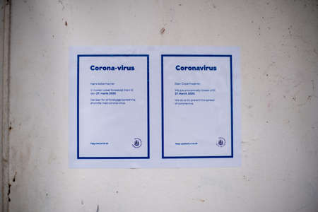 Copenhagen, Denmark - March 17, 2020: Sign on a door informing about a closed public toilet due to the coronavirus.