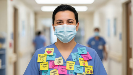 Male healthcare worker with thank you notes on scrubs in hospital hallway.