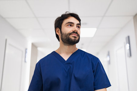 A doctor in blue scrubs walks down a bright clinic hallway, looking thoughtful.