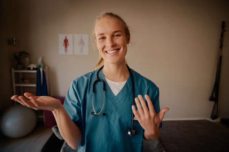 Portrait of happy nurse explaining with hand gestures in medical uniform and stethoscope
