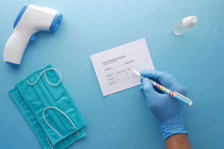 Doctor man records the patients symptoms in his notebook. Unrecognizable doc in medical white coat and gloves writing on purple studio background.